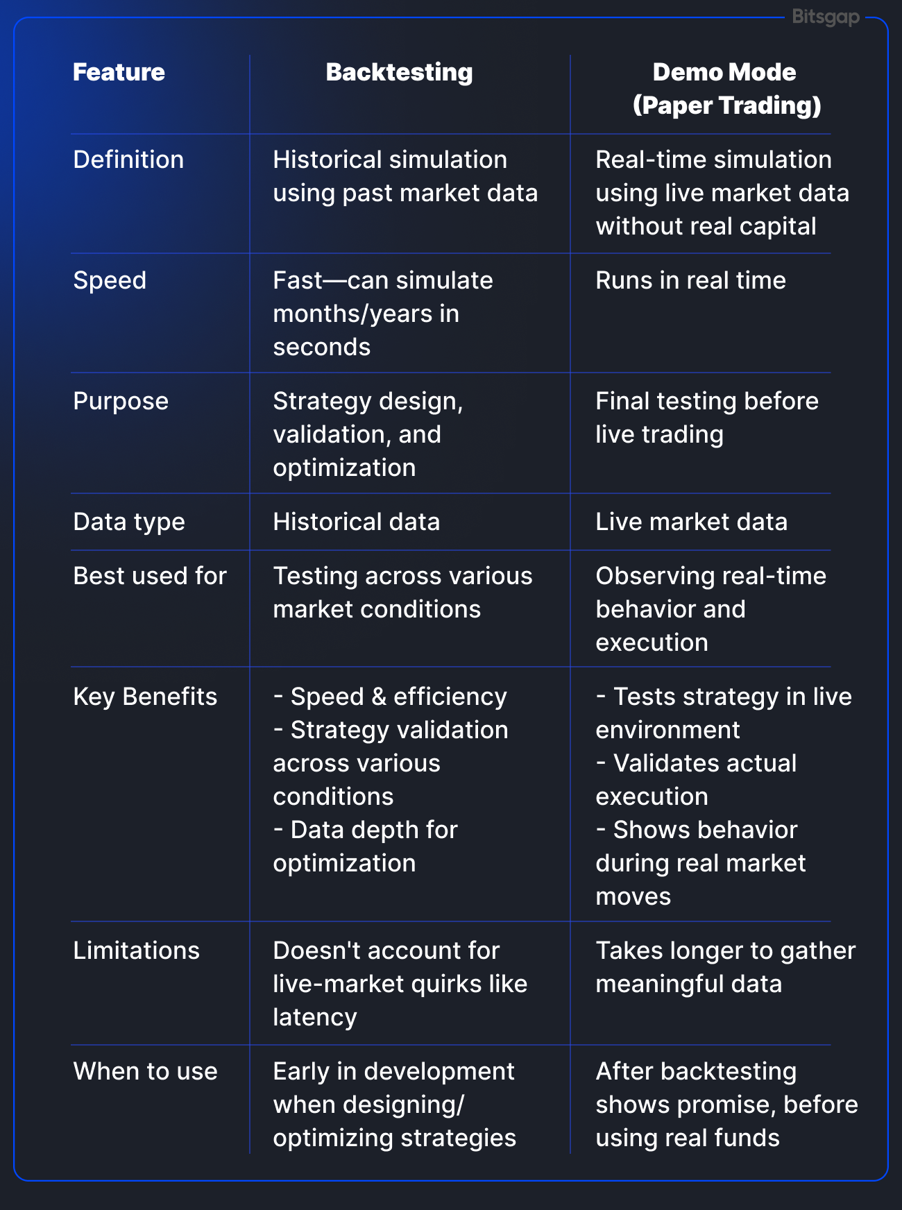 While both backtesting and demo mode are essential tools for strategy development, they serve different purposes—and knowing when to use each can make your trading process far more effective. Backtesting gives you a data-driven look into past performance, while demo trading simulates live market conditions. Used together, they provide a powerful one-two punch for validating and fine-tuning your approach.