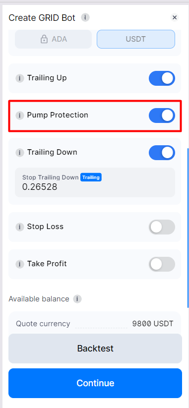 - Um Pump Protection zu deaktivieren, schalten Sie die Trailing-Funktion während der Bot-Einrichtung vollständig aus.