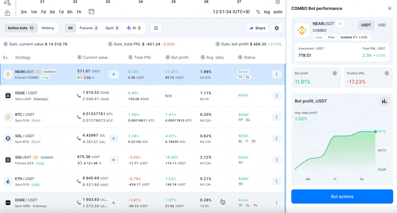 - Wenn eine unregelmäßige Preisbewegung festgestellt wird, ändert sich der Status des Bots auf "Pump":