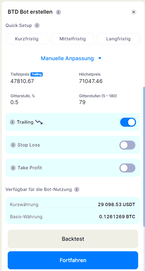 Der Buy-the-Dip (BTD)-Bot von Bitsgap bietet vielseitige Anpassungsmöglichkeiten, mit denen Sie Ihre Handelsstrategie optimal an die Marktbedingungen anpassen können. Diese Anleitung führt Sie durch die manuellen Einstellungsoptionen, einschließlich der Konfiguration von Preisniveaus, Gitterparametern und Risikomanagement.