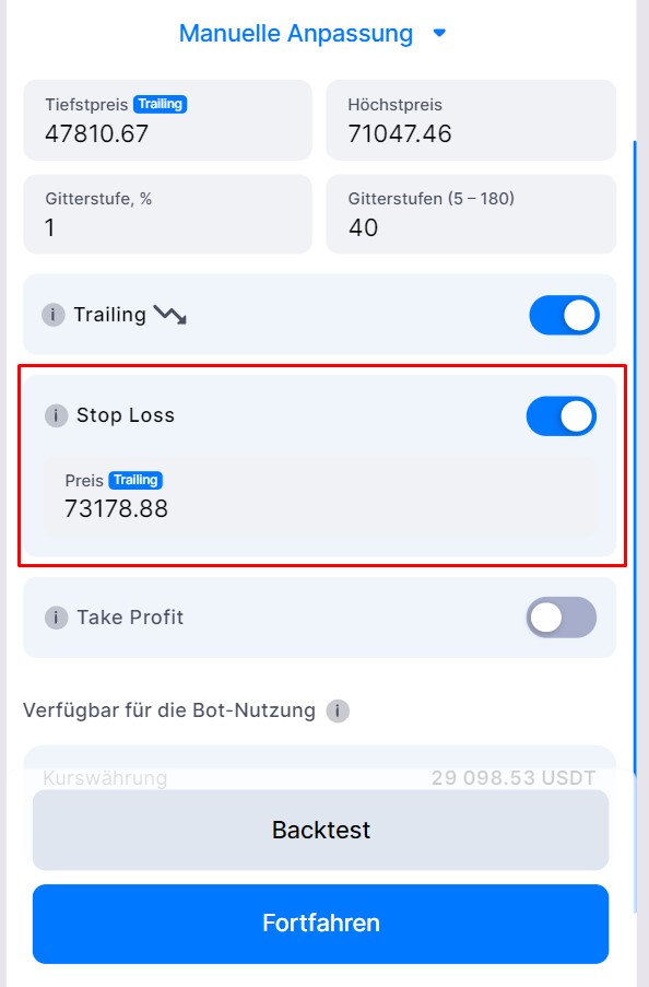 Standardmäßig ist der SL auf 3 % über der obersten Verkaufsorder eingestellt, kann aber bei Bedarf angepasst werden.