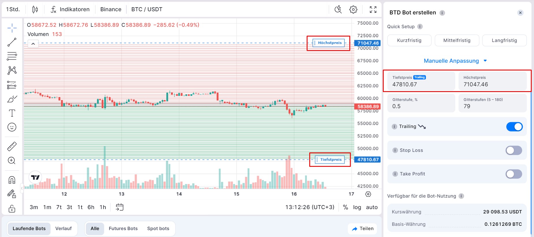 Wenn Sie Ihren BTD-Bot starten, weist das System automatisch obere und untere Grenzen des Handelsbereichs zu. Diese bestimmen die anfängliche Platzierung von Verkaufsorders (oberhalb des aktuellen Preises) und Kauforders (unterhalb des aktuellen Preises).