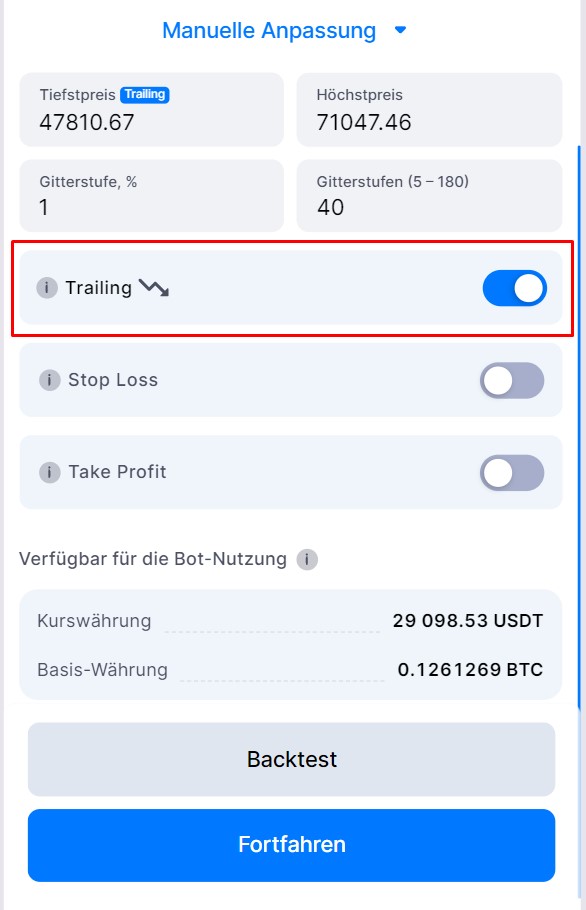 Trailing Down wird automatisch aktiviert, kann aber bei Bedarf deaktiviert werden.
