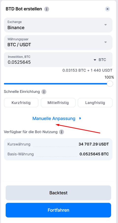 Um die erweiterten Einstellungen Ihres Bots anzupassen, klicken Sie auf die Schaltfläche [Manuelle Anpassung].