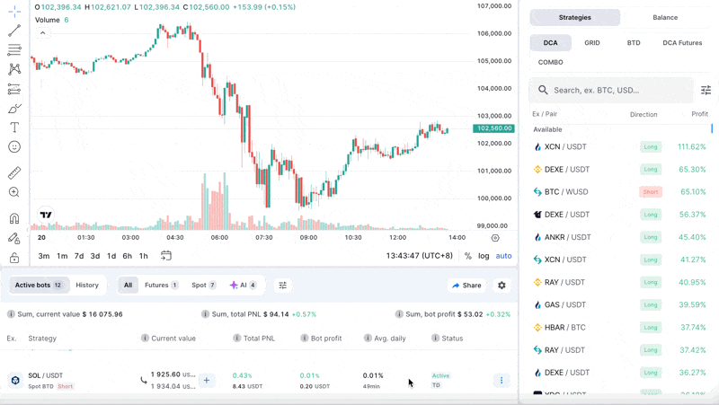 Verfolgen Sie die Ergebnisse Ihres BTD-Bots mithilfe des Performance-Fensters und des Tabs Bot-Orders.