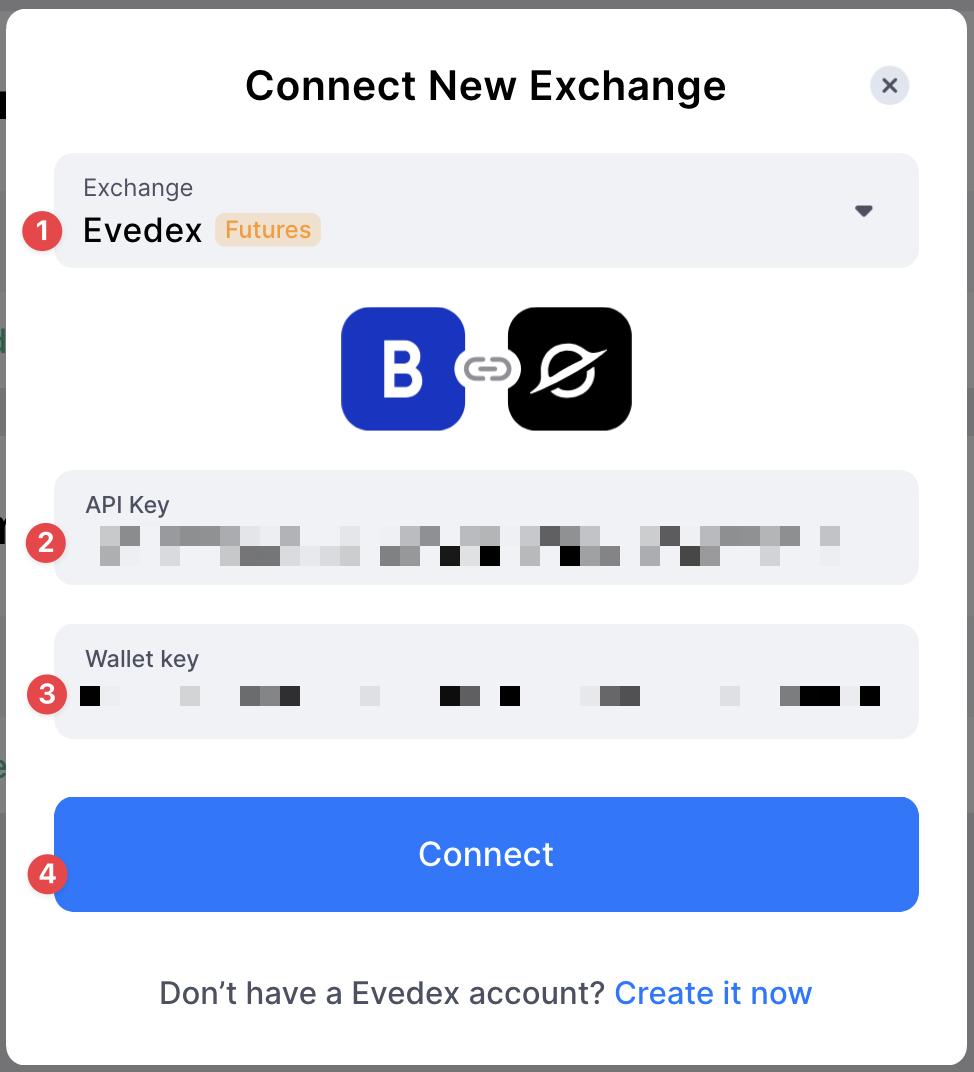 - Wählen Sie Evedex, geben Sie API key und wallet key ein und klicken Sie auf [Connect].