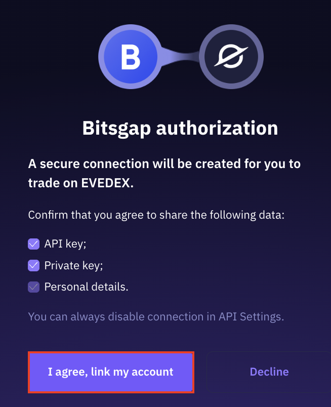 Sobald Sie Ihren API-Schlüssel erstellt und den Wallet-Schlüssel kopiert haben, verbinden Sie Ihr Evedex-Konto mit Bitsgap.