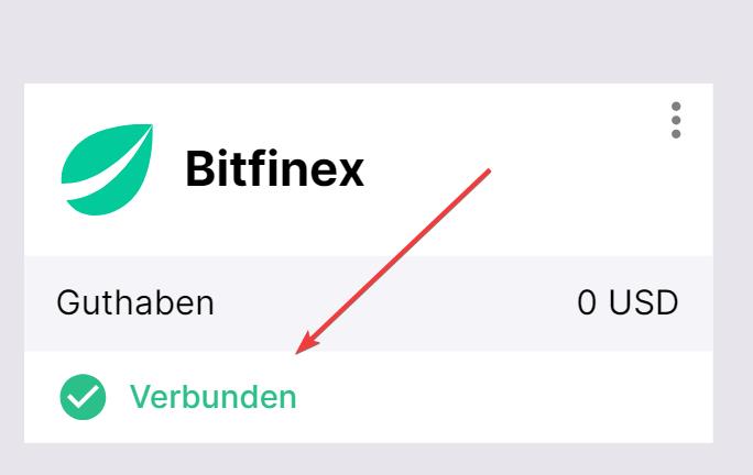 Wenn alles geklappt hat, sehen Sie Bitfinex in der Liste Ihrer verbundenen Exchanges mit dem Status „Verbunden“ und dem Saldo Ihres Trading-Kontos.