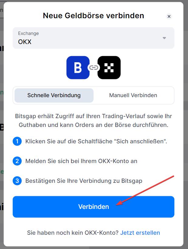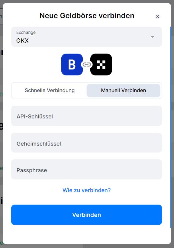 Wählen Sie im Fenster, das sich anschließend öffnet, OKX aus. Fügen Sie im Fenster „Manuell Verbinden“ Ihren API-Schlüssel, geheimen Schlüssel und Ihre Passphrase ein. Klicken Sie anschließend auf [Verbinden].