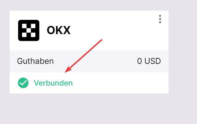 Wenn alles geklappt hat, sehen Sie OKX in der Liste Ihrer verbundenen Exchanges mit dem Status „Verbunden“ und dem Saldo Ihres Trading-Kontos.
