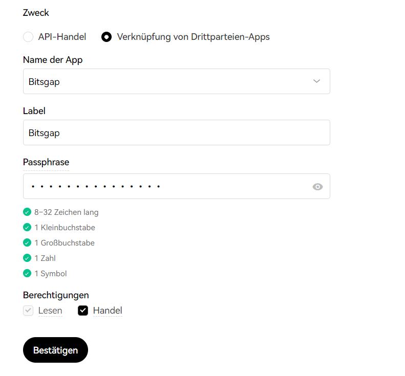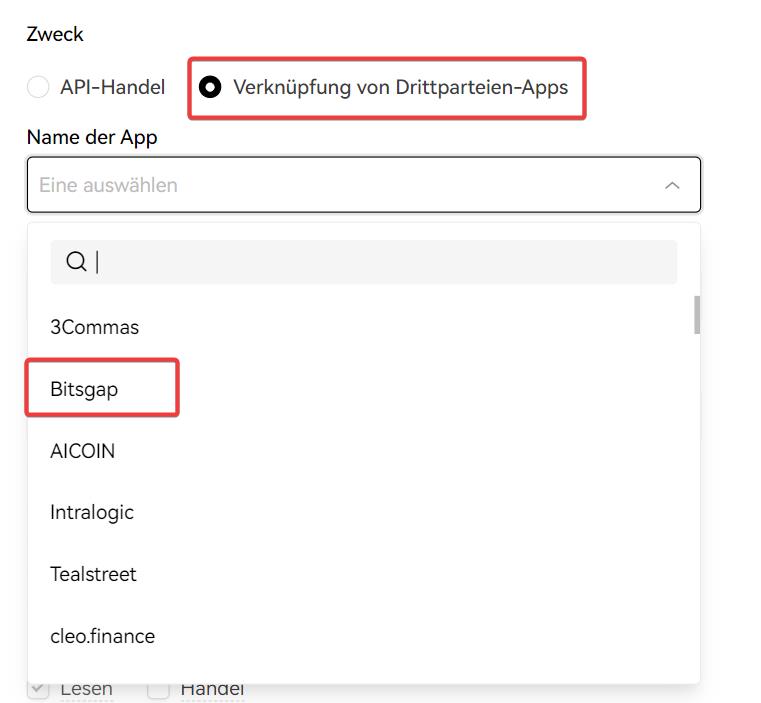 Um einen API-Schlüssel für Bitsgap zu erstellen, müssen Sie auf [Verknüpfung von Drittparteien-Apps] unter „Zweck“ klicken und Bitsgap aus der Liste an App-Namen auswählen.