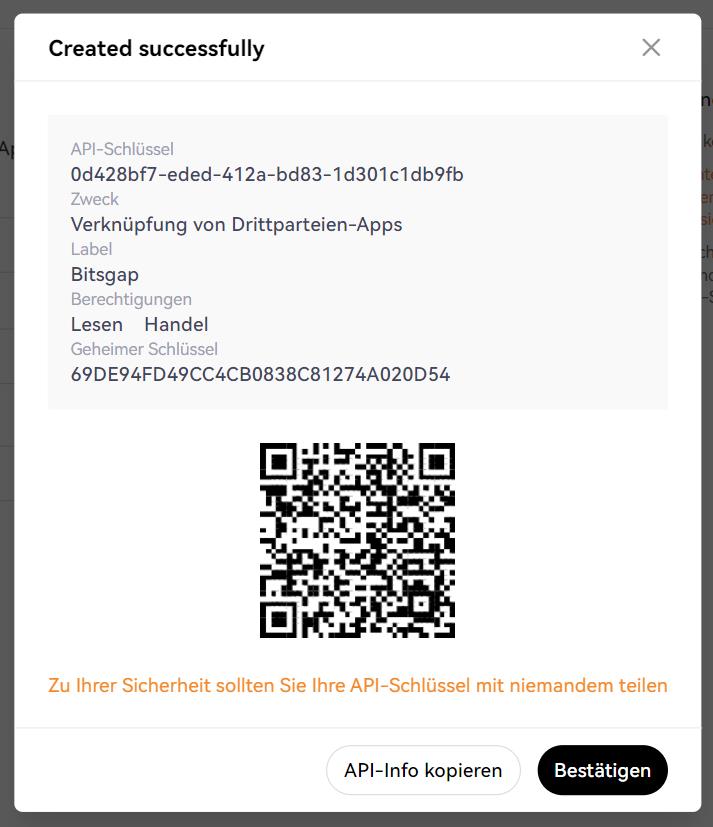 Ihr Trading-Schlüssel für OKX wurde erfolgreich erstellt und kann mit unserer Plattform verknüpft werden! Bitte kopieren Sie Ihren API-Schlüssel und Ihren geheimen Schlüssel und speichern sie an einem sicheren Ort bevor Sie sie zu Bitsgap hinzufügen.