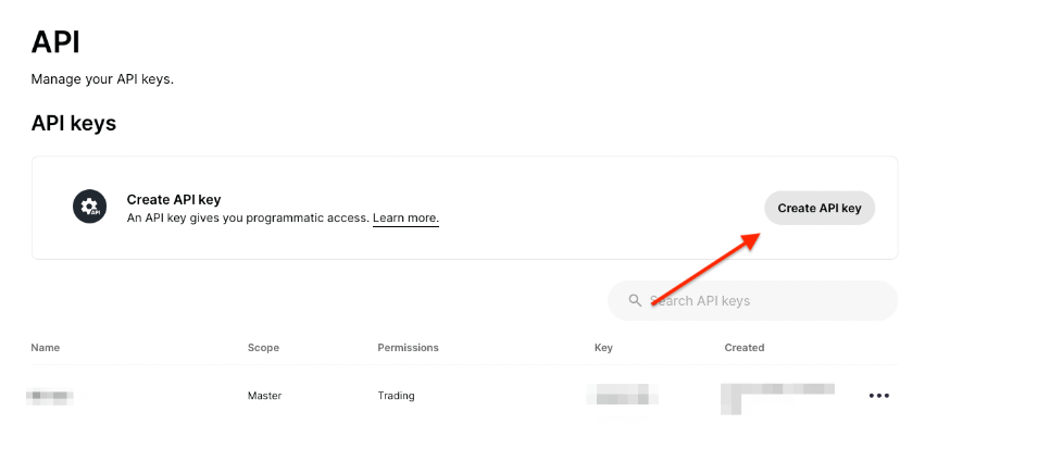 Klicken Sie auf [Create API key], um Ihre API-Info zu ändern.