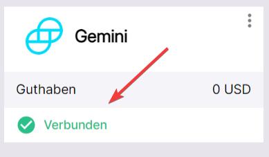 Wenn alles geklappt hat, sehen Sie Gemini in der Liste Ihrer verbundenen Exchanges mit dem Status „Verbunden“ und dem Saldo Ihres Trading-Kontos.