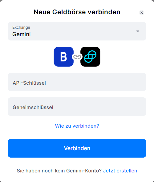 Wählen Sie im Fenster, das sich anschließend öffnet, Gemini aus. Das öffnet ein neues Fenster, indem Sie Ihren API-Schlüssel und geheimen Schlüssel eingeben müssen. Klicken Sie anschließend auf [Verbinden].