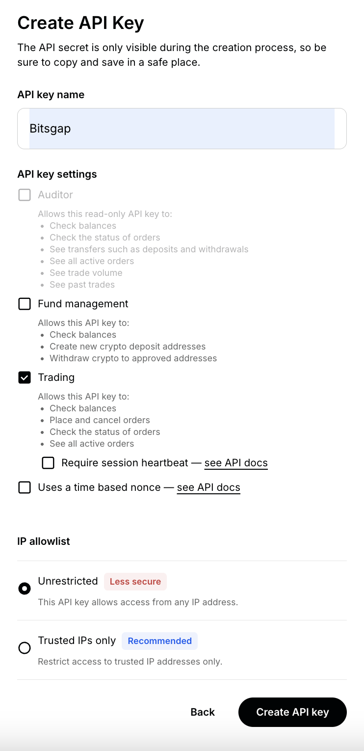 Geben Sie Ihrem API-Schlüssel irgendeinen Namen (dies ist ganz Ihnen selbst überlassen), sodass Sie auf einen Blick sehen können, dass dieser Schlüssel mit ihrem Bitsgap-Konto verknüpft ist.