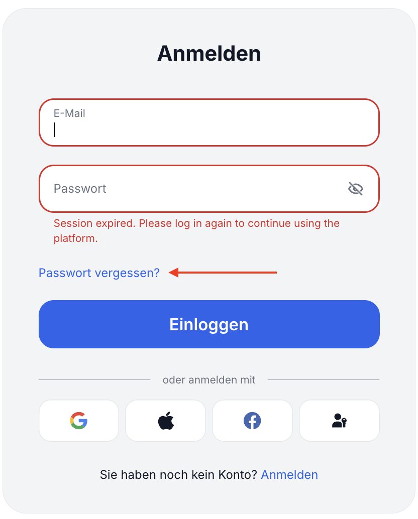 Dieser Link leitet Sie zur Seite „Passwort zurücksetzen“ weiter. Geben Sie Ihre E-Mail-Adresse ein und fordern Sie einen Wiederherstellungslink an. Die Anweisungen werden innerhalb von 5 Minuten an Ihre E-Mail-Adresse gesendet. Wenn Sie die E-Mail für das Zurücksetzen des Passworts nicht in Ihrem Posteingang finden, überprüfen Sie bitte den Spam-, Junk- oder Promotions-Ordner.