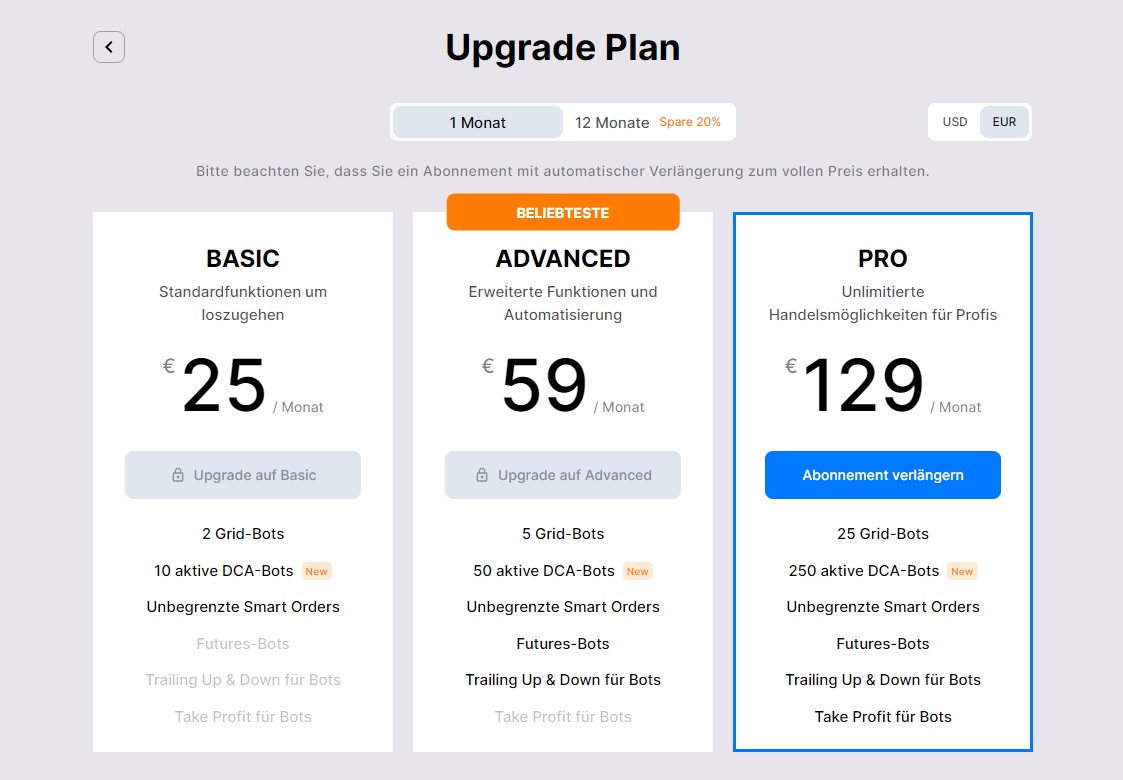 Wählen Sie den Abonnementplan aus, den Sie kaufen möchten, und klicken Sie auf die Schaltfläche [Upgrade zu…] oder [Abonnement verlängern]. -