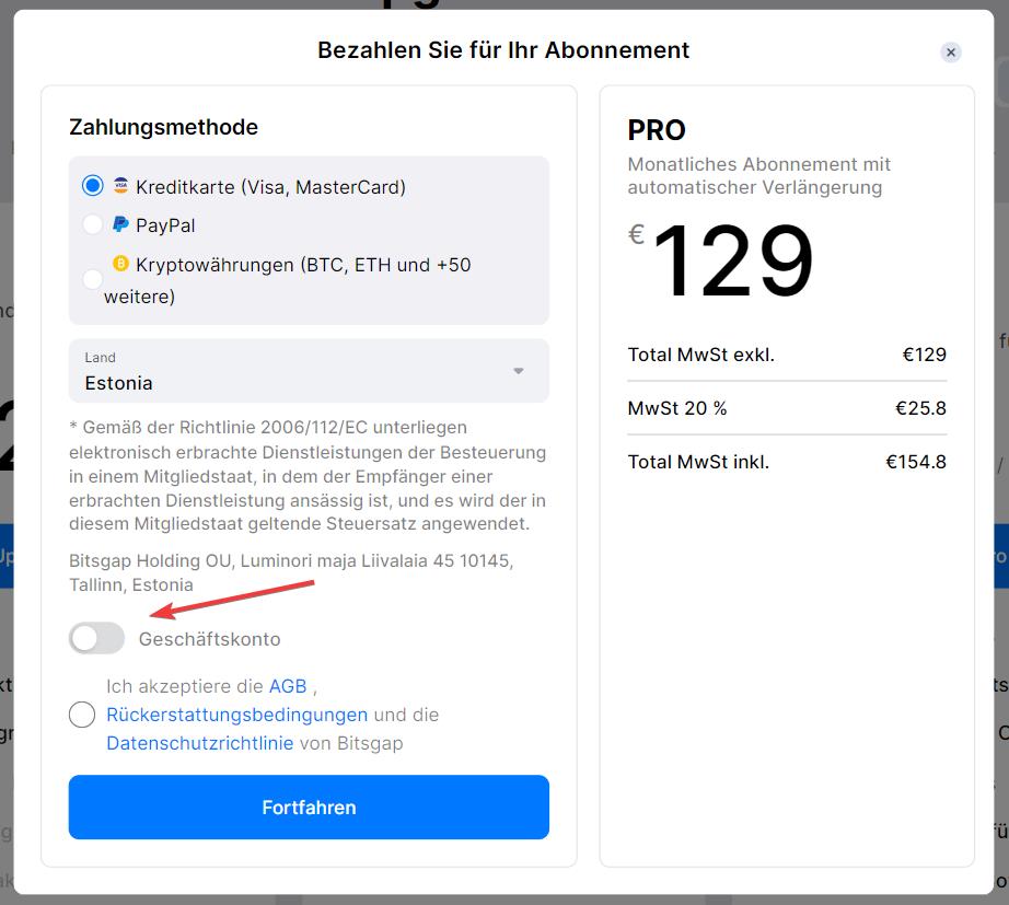 Wenn Sie ein europäisches Unternehmen sind, ermöglicht es Ihnen Bitsgap, Umsatzsteuer-befreite Zahlungen für Abonnementpläne über Ihr Geschäftskonto vorzunehmen. Hier erfahren Sie, wie Sie einen Plan mit Ihrem Geschäftskonto kaufen können.