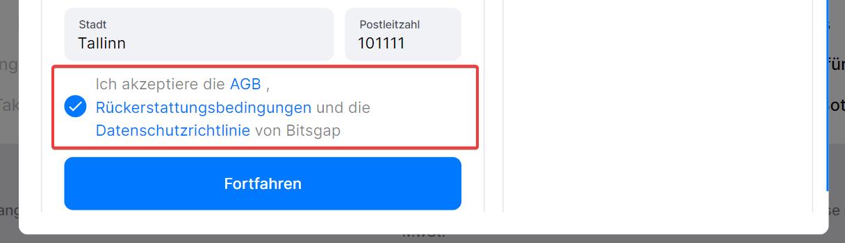 Überprüfen und akzeptieren Sie die Allgemeinen Geschäftsbedingungen und die Datenschutzrichtlinie und klicken Sie auf [Weiter], um fortzufahren. -
