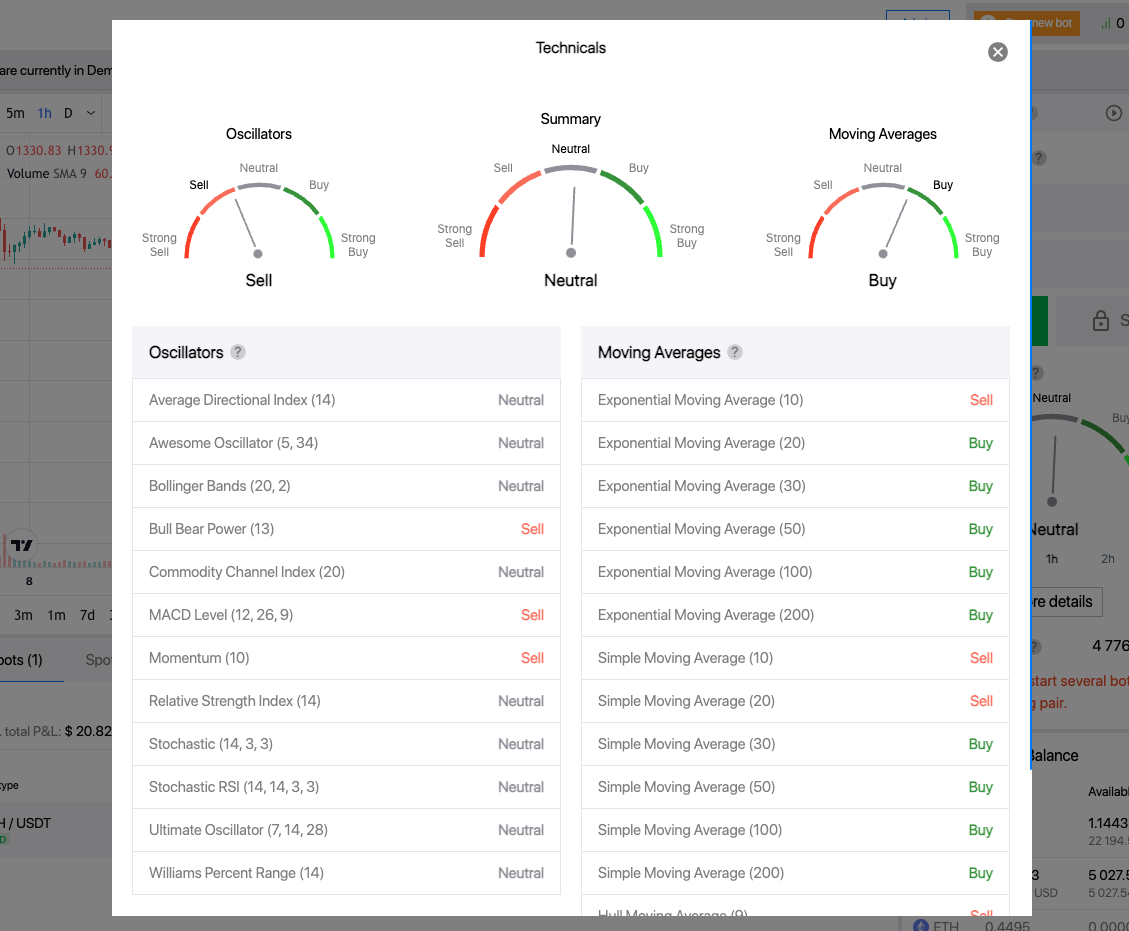As you may have already noticed, we have implemented technical indicators directly to the DCA bot creation form. In the future, we plan to add these indicators as conditions for opening and closing deals for this particular bot. But today, you can open a modal window either on the Trading page or the Bots page and see the complete list of indicators and their current status.