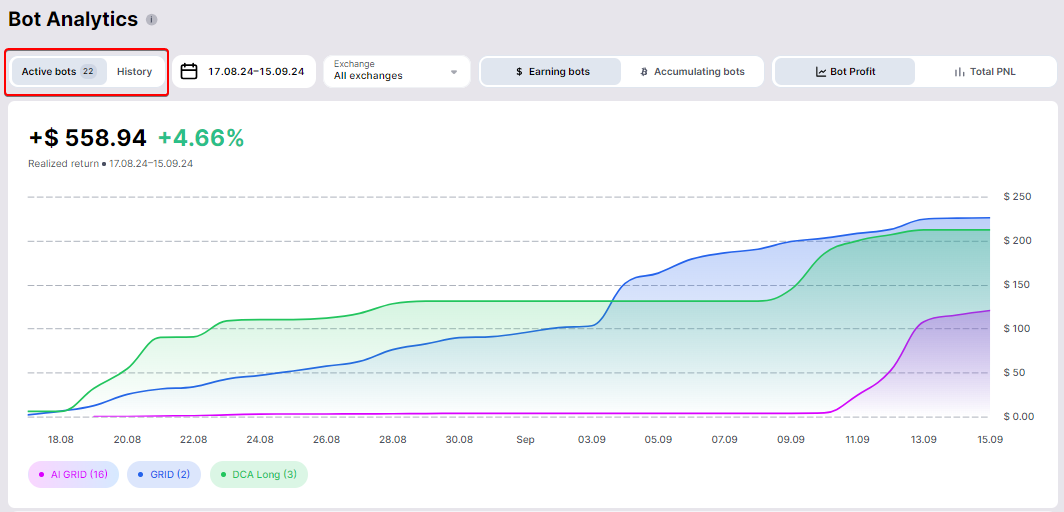 We have added new analytics capabilities for active bots. This enhancement provides deeper insights into the performance of your bots, allowing you to track their effectiveness and make data-driven adjustments to your trading strategy: