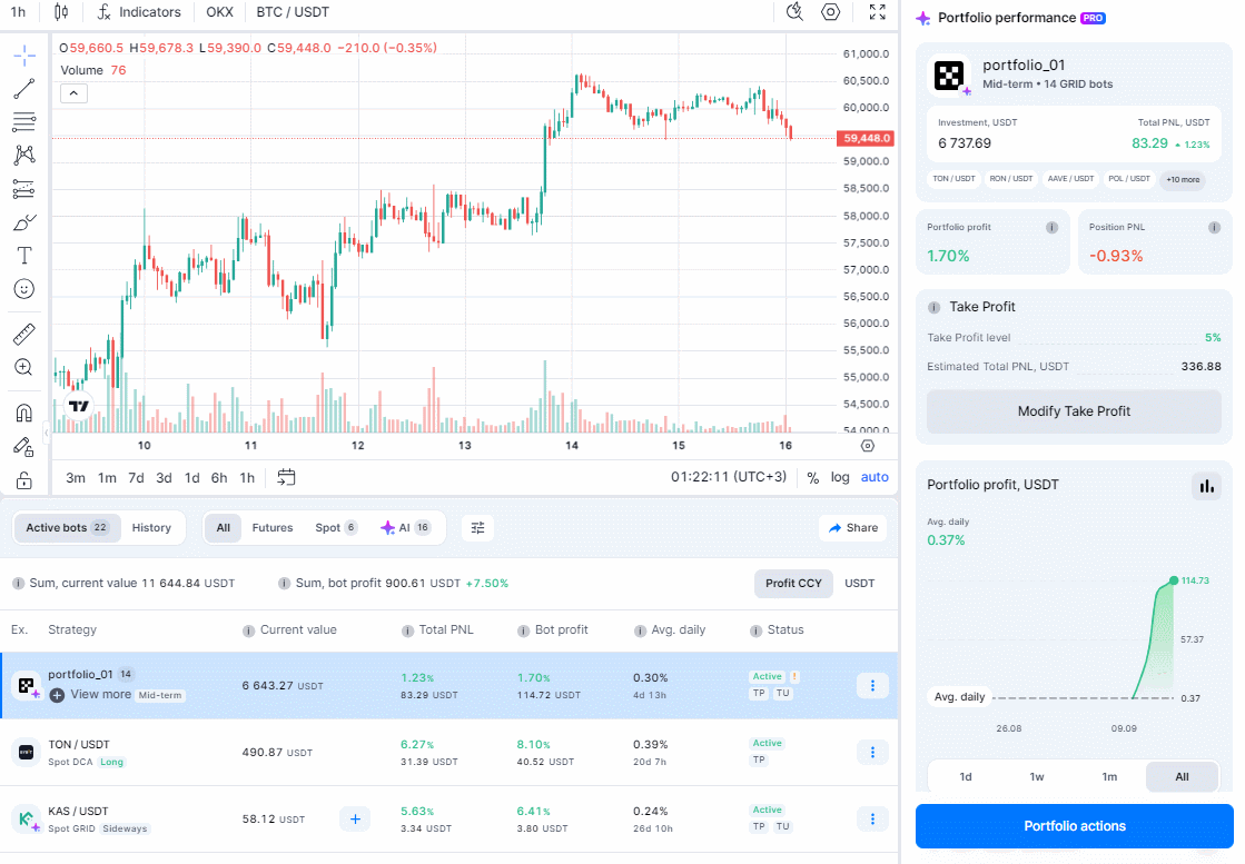 • Portfolio Mode: We have introduced Portfolio Mode, which allows you to launch a group of AI bots as a unified portfolio. This new feature enables you to set a unified Take Profit for the entire portfolio and use Portfolio actions, simplifying the management of multiple bots: