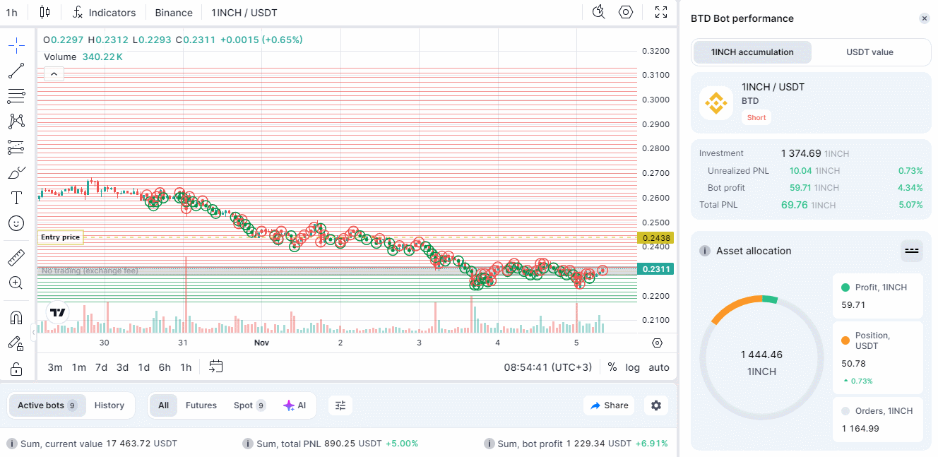 • In the Bot Performance menu, the Asset allocation block now dynamically updates depending on currency display mode. When viewing in base currency, the Position information is shown in the quote currency, and Orders are shown in the base currency. Switching to quote currency mode reverses this: Position displays the base currency, and Orders show the quote currency. This makes currency distribution and performance metrics clear and accessible, tailored to the chosen display preference.