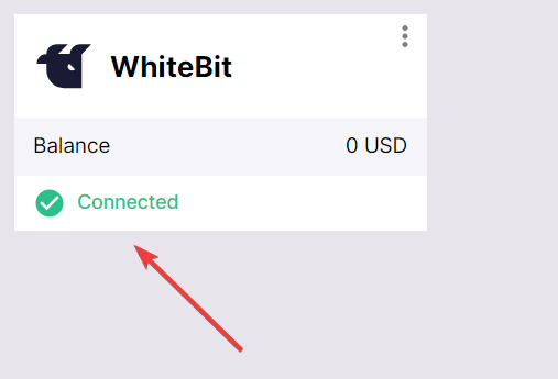 - Once the connection is successful, you will see WhiteBIT listed among your connected exchanges, with the status marked as Connected.