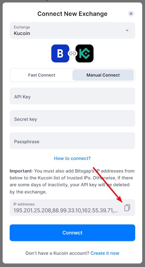 - Select Kucoin and copy the listed Bitsgap IP addresses.