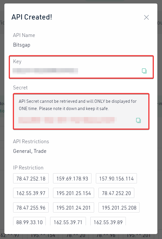 - IP Restriction: Enabled (add the Bitsgap IPs).