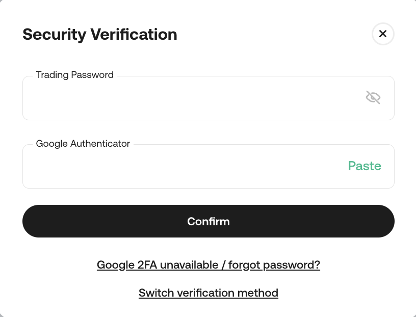 - Enter your trading password, and 2FA code. Confirm to create the API key.