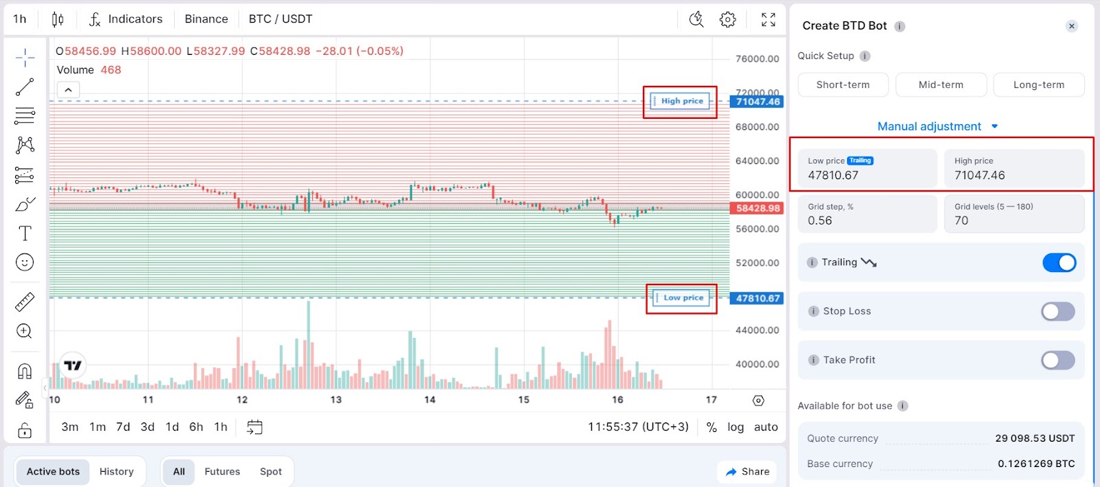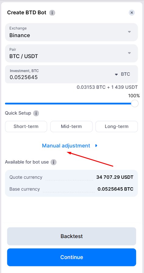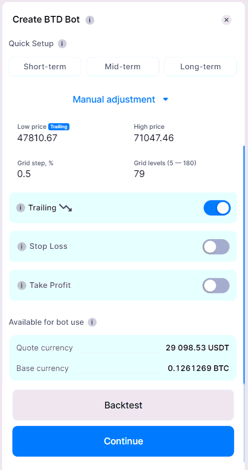 The Bitsgap Buy-The-Dip (BTD) bot provides versatile customization options, enabling you to tailor your trading strategy to market conditions. This guide walks you through the manual adjustment settings, including configuring price levels, grid parameters, and managing risks.