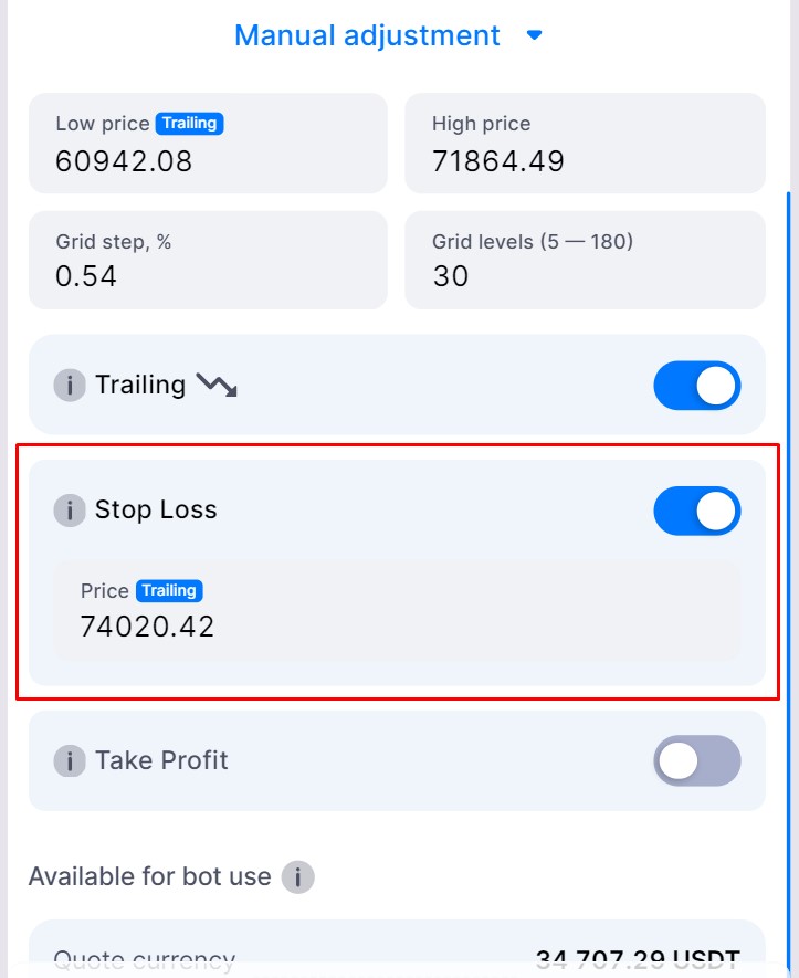 The Trailing Down feature helps your bot adapt when prices drop below the grid range. It cancels upper sell orders and places new buy orders at the grid's bottom without requiring additional funds or manual adjustments.
