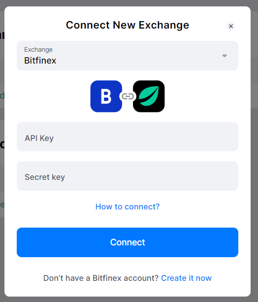 In the pop-up window, select Bitfinex from the exchange list. Paste your API Key and Secret Key into the appropriate fields, then click [Connect].