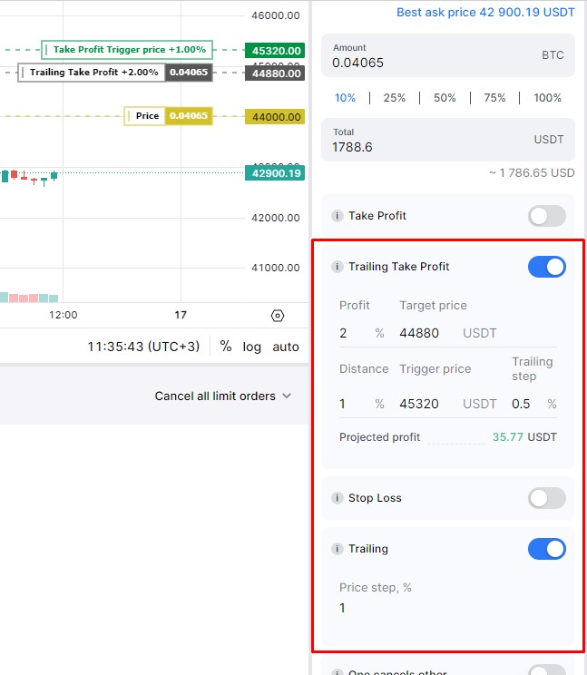 After that, Trailing Take Profit will follow the price on the rise and execute the sell order when the drawback takes place. This setup allows you to purchase the coin at the best price possible when the rally begins and sell it at the top when the price starts to fall.