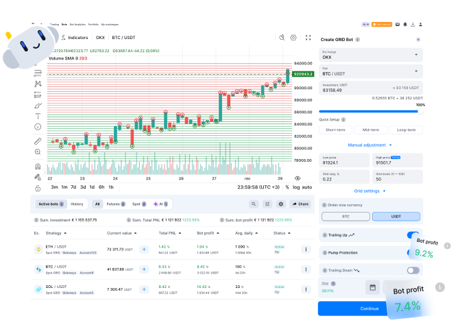 El altamente eficiente bot de criptomonedas basado en la estrategia grid. Utilícelo para maximizar las ganancias en cada cambio de precio en un mercado lateral.