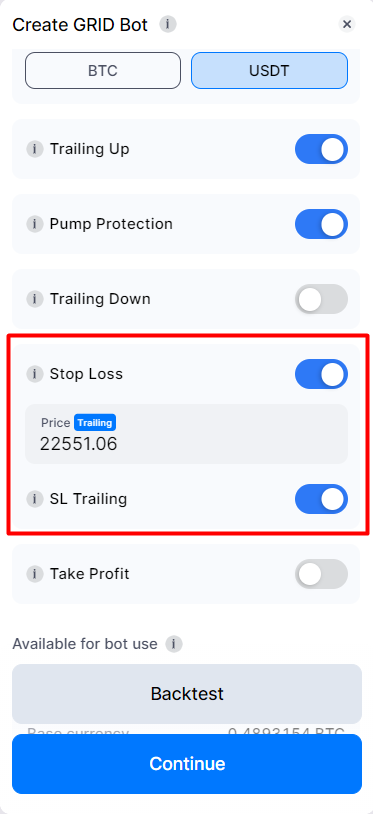 - Cuando Trailing Up (para GRID Bot) o Trailing (para BTD Bot) está habilitado, el Stop Loss sigue la cuadrícula a un intervalo fijo siempre que esta se mueva.