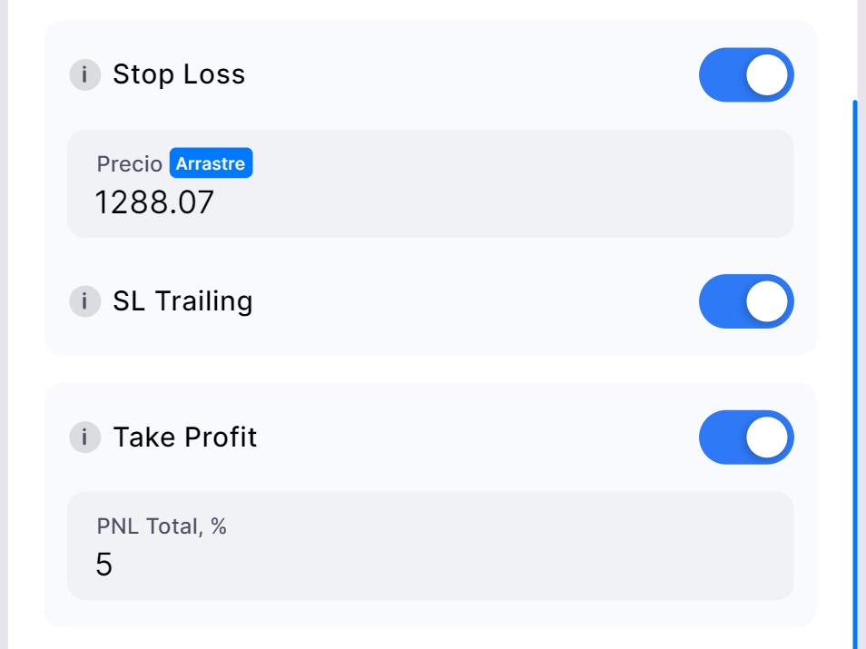 Take Profit (TP) y Stop Loss (SL) son características esenciales para controlar el riesgo y la rentabilidad de tus operaciones. Estas configuraciones aseguran que tu bot salga automáticamente de las posiciones en los niveles predeterminados de ganancia o pérdida.