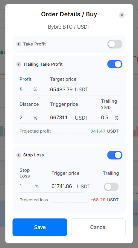 El panel de edición te permite activar/desactivar y modificar Take Profit, Trailing Take Profit y Stop-Loss. Puedes ajustarlos insertando el porcentaje deseado o un precio de activación.