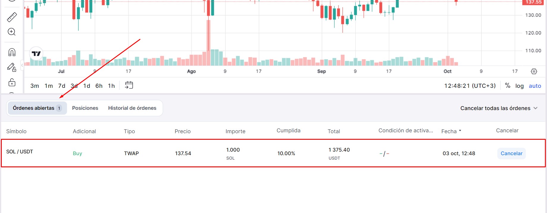 - Cumplida: el porcentaje de ejecución de la orden. Con este valor, puede entender cuántas órdenes de mercado (partes de su orden TWAP) se han completado y cuánto falta para que la operación se complete en su totalidad.