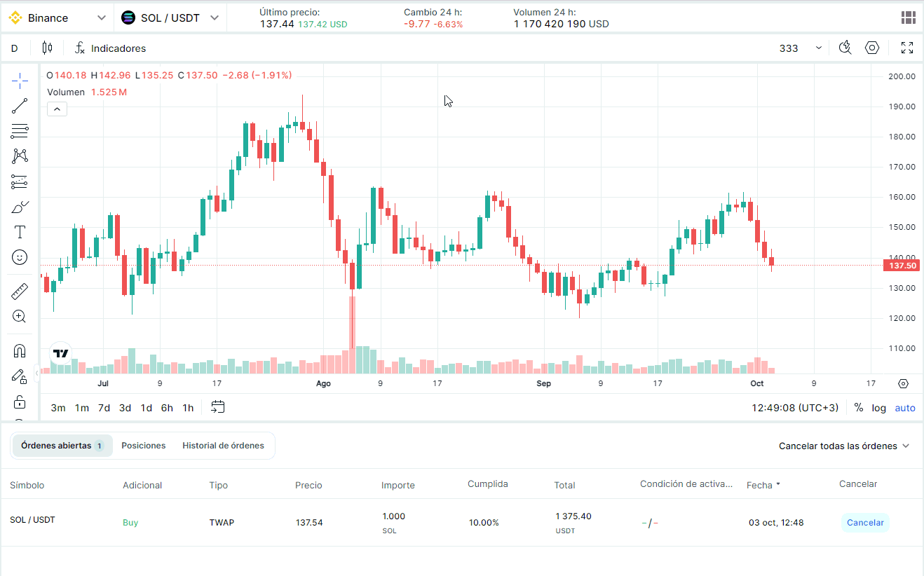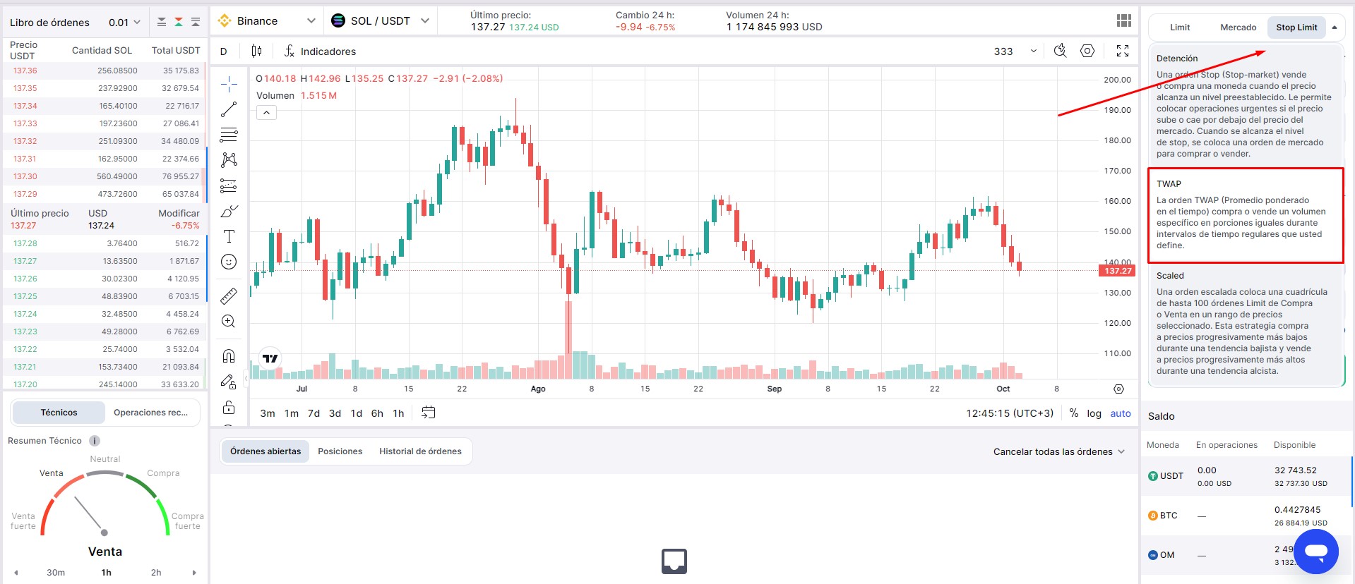 - Total: el valor estimado de todas las órdenes de mercado dentro de su operación TWAP.