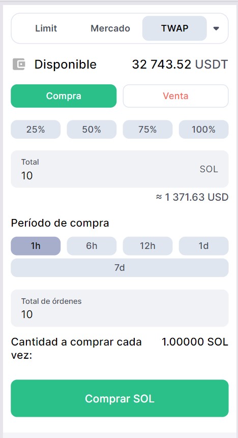En el ejemplo anterior, queremos comprar 10 SOL en 1 hora, dividiendo la compra en 10 órdenes. Con cada orden, compraremos 1 SOL al precio de mercado. Cada orden de mercado se ejecutará cada 6 minutos: el período de compra (60 minutos) dividido entre el número total de órdenes (10).
