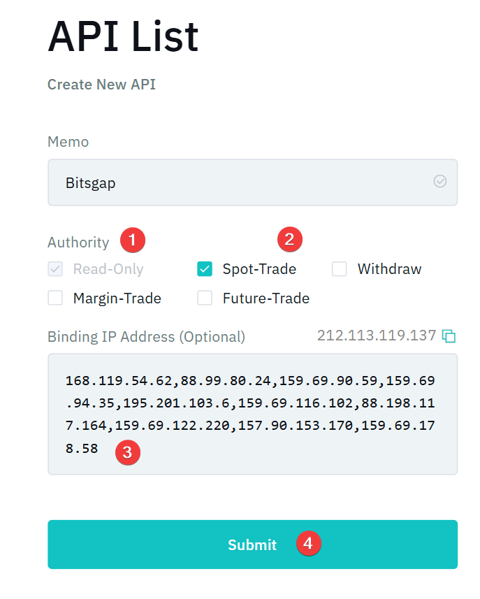 - Regresa a Bitmart y pégalas en la sección Binding IP addresses.