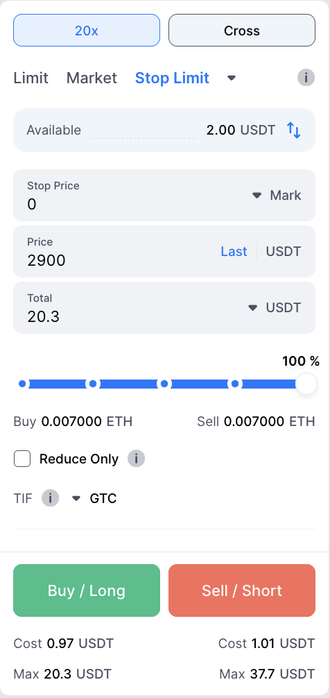 Nota: Al establecer el precio Stop, puedes elegir basarte en el Mark Price (más estable, evita la manipulación de precios — recomendado para mayor seguridad ante liquidaciones) o en el Last Price (basado en la transacción más reciente — puede ser más volátil).