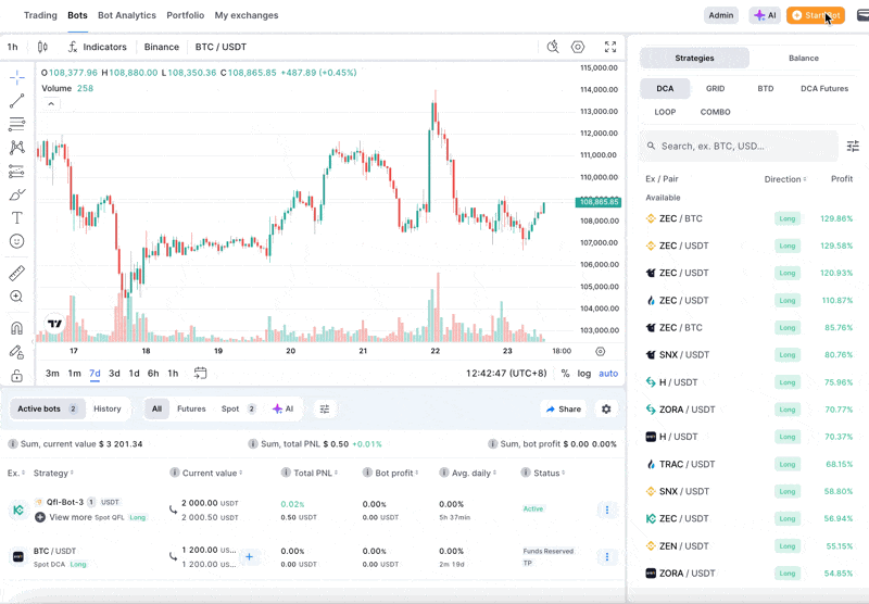 Funciona de manera similar al bot DCA, pero a diferencia de los bots de un solo par, el bot QFL puede operar con varios pares simultáneamente, abriendo posiciones independientes según las señales QFL.