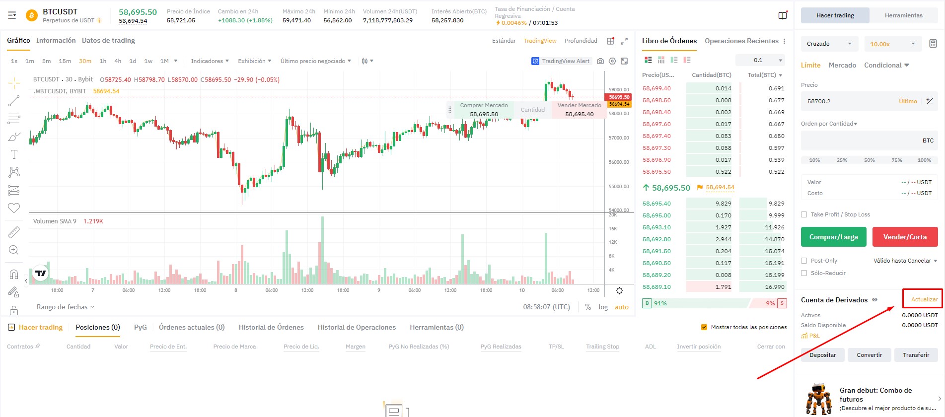 Es esencial actualizar a la UTC para poder operar en el exchange a través de Bitsgap. Para ello, vaya a la página de Trading o Derivados de Bybit y haga clic en la opción Actualizar: