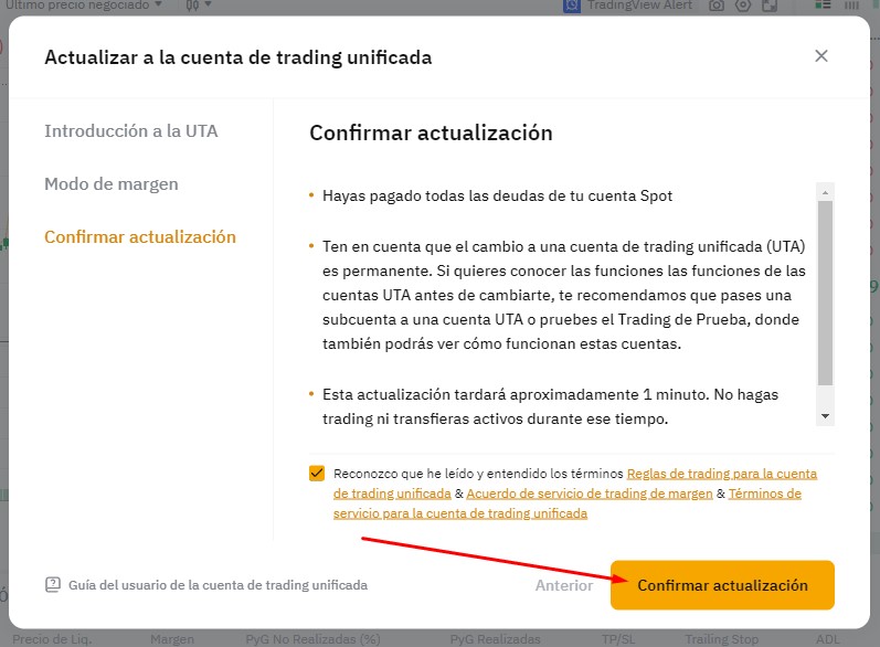Lea la introducción y los detalles en la ventana emergente para entender mejor el Trading Unificado. Luego, haga clic en [Confirmar actualización] para completar la transición a la UTA: