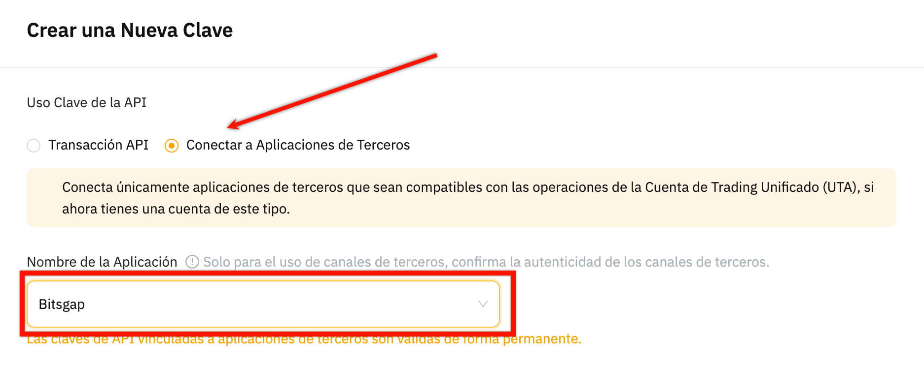 Primero, elija la opción Conectar a Aplicaciones de Terceros y seleccione Bitsgap en Nombre de la Aplicación.