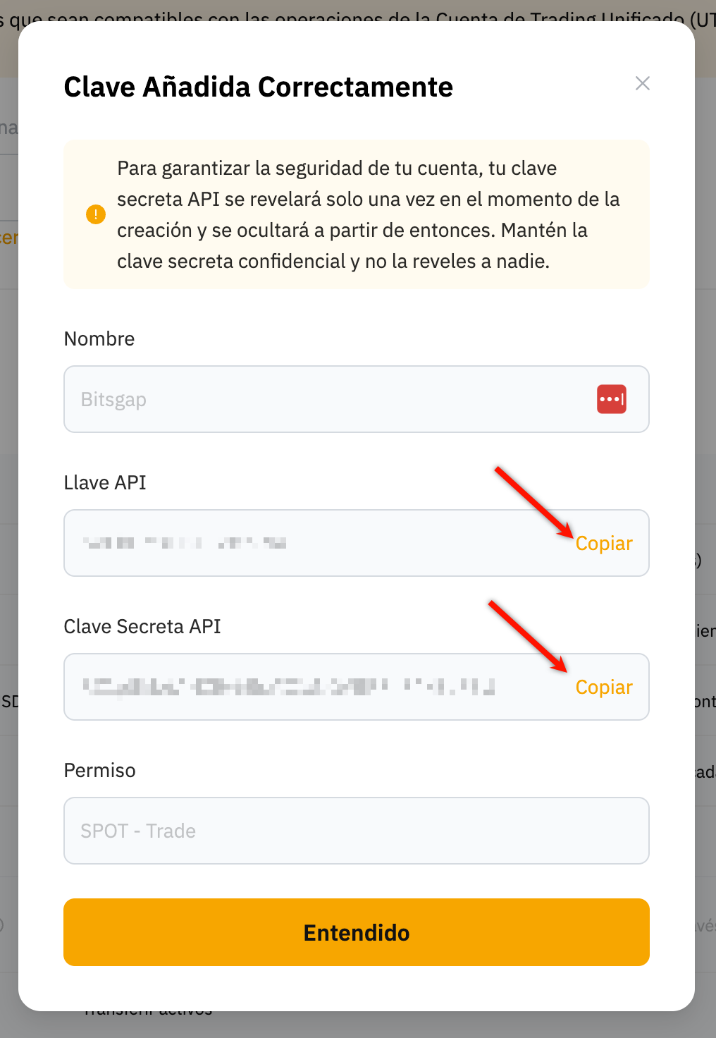 ¡Su clave de trading de Bybit se creó con éxito y está lista para conectarse a nuestra plataforma! Por favor, copie su clave API y clave Secreta en un lugar seguro antes de agregarlas a Bitsgap. Una vez que haga clic en Entendido, ya no verá su clave API.